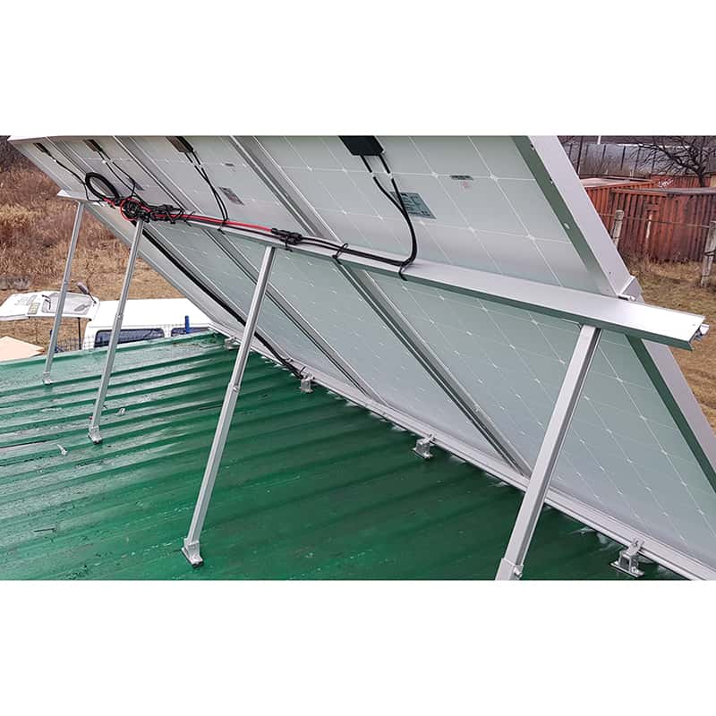 Данный комплект предназначен для монтажа солнечных батарей на плоской или наклонной поверхности (земле, крыше из мягкой черепицы либо металлочерепицы) в один ряд. Регулируемый угол наклона ( от 30 до 360 градусов ), позволяет эффективней использовать батареи, за счет изменения площади воздействия прямых солнечных лучей.